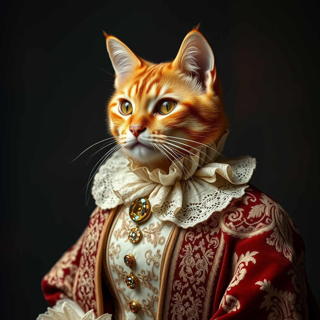 Orange tabby cat in an elaborate Victorian-style costume featuring a ruffled lace collar and a luxurious velvet robe adorned with intricate patterns and delicate embroidery, showcasing an air of nobility and elegance. The feline is set against a deep, shadowy backdrop, striking a poised and regal stance while wearing exquisite, ornate jewels that catch the light. The portrait captures every fine detail and texture of the attire, combining historical fashion with a sharp focus to emphasize the cat's aristocratic presence.
