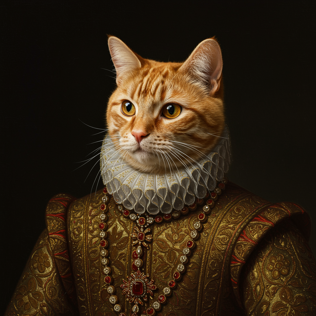 Orange tabby cat in an elaborate renaissance outfit, featuring a luxurious ruff collar and a shimmering golden robe. The portrait highlights its noble demeanor, with intricate embroidery and ornate jewels adding elegance. The cat strikes a regal pose against a dark backdrop, showcasing sharp focus and rich textures that evoke historical fashion. Subtle variations in the pattern of the fabric bring a unique twist to the traditional theme.