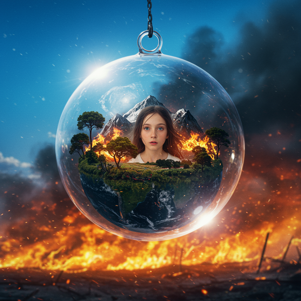 A glass orb suspended in a radiant blue sky, encases an extraordinarily detailed miniature planet ablaze with fiery mountains and lush trees. In the backdrop, a post-apocalyptic world burns fiercely, with swirling ash and embers dancing across the scene. The orb cradles the image of a beautiful young girl, seemingly trapped within its confines, her expression a mix of wonder and longing. The stark contrast between the serene sky and the fiery chaos presents a haunting yet mesmerizing vision.