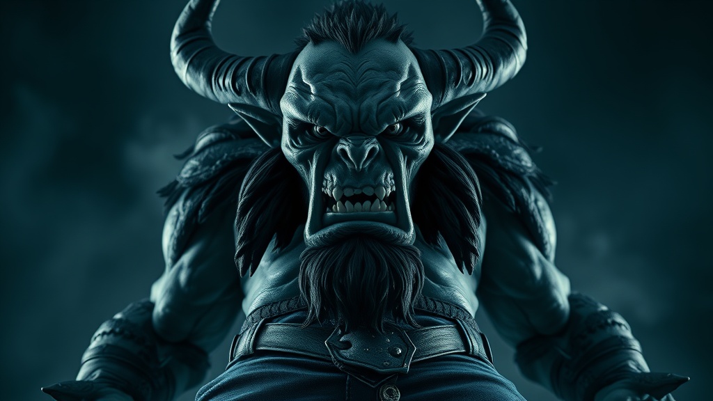 A powerful orc chieftain exudes palpable anger and domination, standing tall in a menacing pose. This low-angle viewpoint amplifies his intimidating presence, with a symmetrical face intricately detailed to capture every line of his rage. Rendered with smooth sharpness, this masterpiece channels the chilling allure of horror art, reminiscent of renowned artists like Stanley Lau, Jason Chan, and Mark Hill. The scene is captured in a 4K HDR 35mm photography style, trending on ArtStation, showcasing a blend of monochrome artistry with subtle hints of blue accents. The chieftain is clad in centered blue jeans, creating an unexpected modern twist, while a subtle haze and blur add depth to the portrait. Despite the seeming plasticity of the form, emblematic of 3D rendered dolls, the focus remains steady on the chieftain's unclear eyes, adding a mysterious quality to his visage. Despite his body appearing cropped or malformed by intentional design, the composition avoids any extraneous limbs or imperfections, maintaining a sleek and terrifying aesthetic free from any distortion or watermark distractions.