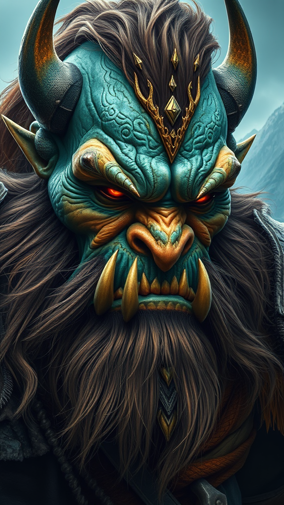 Orc chieftain Duratan from a fantasy realm, portrayed in a medium closeup with epic realism, striking intricate details, and a cinematic flair, depicted in a vibrant palette of teal and amber hues, exuding a powerful and noble presence with a rugged yet noble visage, set against a dramatic landscape that enhances his commanding aura.