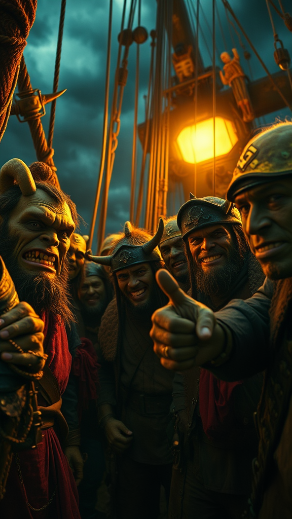 Orc crew taking a lighthearted group selfie on a treacherous raid, golden hour, stormy night, single RAW camera shot, high contrast, and soft natural light amidst the cluttered and eerie pirate ship, utilizing the X-Pro3 and its 26.1 megapixel APS-C sensor to capture the intricate details, and the flexibility of the Fujifilm film simulation to create a nostalgic and textured aesthetic, emphasizing the analog look and feel of a classic film, captured at ISO 1600 to deliver a smooth and rich cinematic experience.