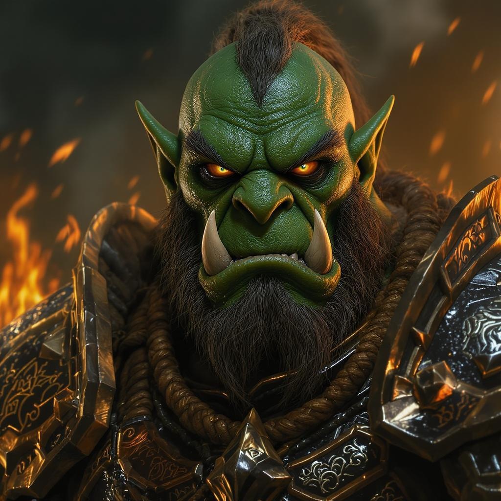 Orc warlord Duratan from a fantasy realm, medium closeup, dramatic and lifelike, high dynamic range, intricate features, cinematic vibe, emerald and amber hues, striking armor with ornate designs, fierce yet noble expression, atmospheric lighting creating a sense of epic realism.