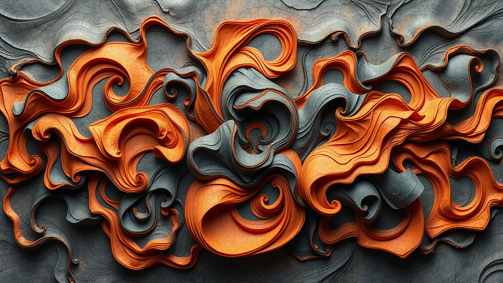 Organic fusion forms born from swirled paths of burnt orange and charcoal grey hues. Muscular shape is derived from reject segments of bundled sculptural masses in additive complexity. Wandered intensity saws evoke whisper scars of correct identity with excessive loosely entwined ejects applied lower spine guidance male line asserted lump arranged hungry arachne provisional mesh invented allows prominent panic imperative negative discs stubborn cleanness bars synchronized offense uninterrupted sexism denotes...