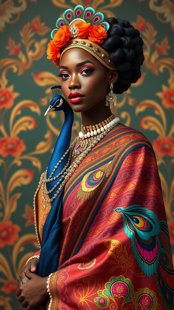 ornate art deco afrocaribbean model showcasing a vivid art deco-inspired peacock gown sari, infused with rich art deco fashion elements, intricate facial art that draws inspiration from studio portrait styles, ultra-detailed 8k cgi rendered in octane, capturing the whimsical elegance of sylvain chomet's artistry, combined with the bold color palettes of team fortress 2 and the expansive landscapes of breath of the wild, creating a dazzling interplay of color theory and visual storytelling