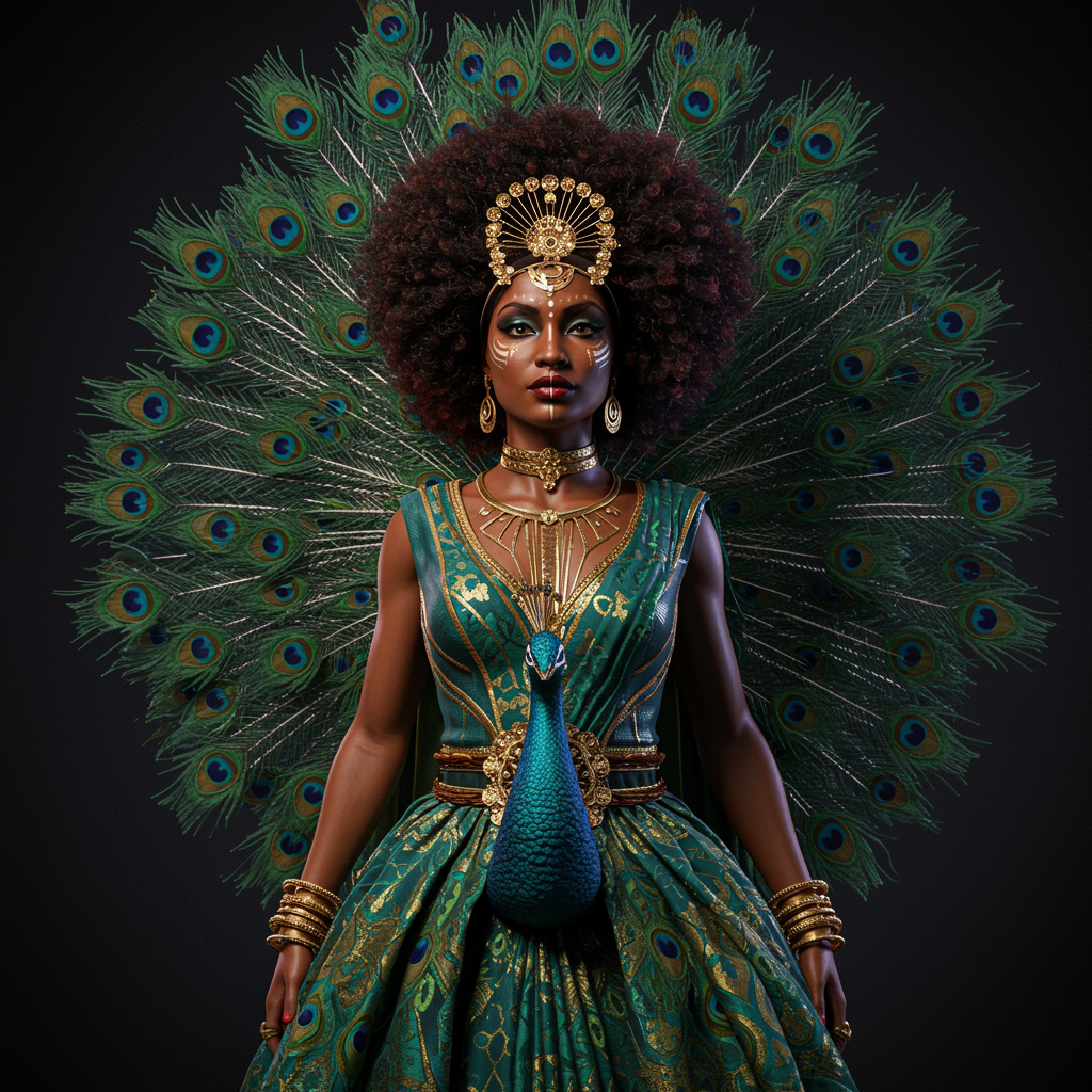 ornate art deco afrocaribbean model showcasing a vibrant peacock-inspired gown with a sari twist, merging art deco fashion elements, intricate face art detail as reference, captured in a studio portrait, rendered in hyper-realistic 8k cgi using octane, blending styles of sylvain chomet with a whimsical touch reminiscent of team fortress 2 and a fantastical palette inspired by breath of the wild, employing striking colour theory for a visually dynamic effect.