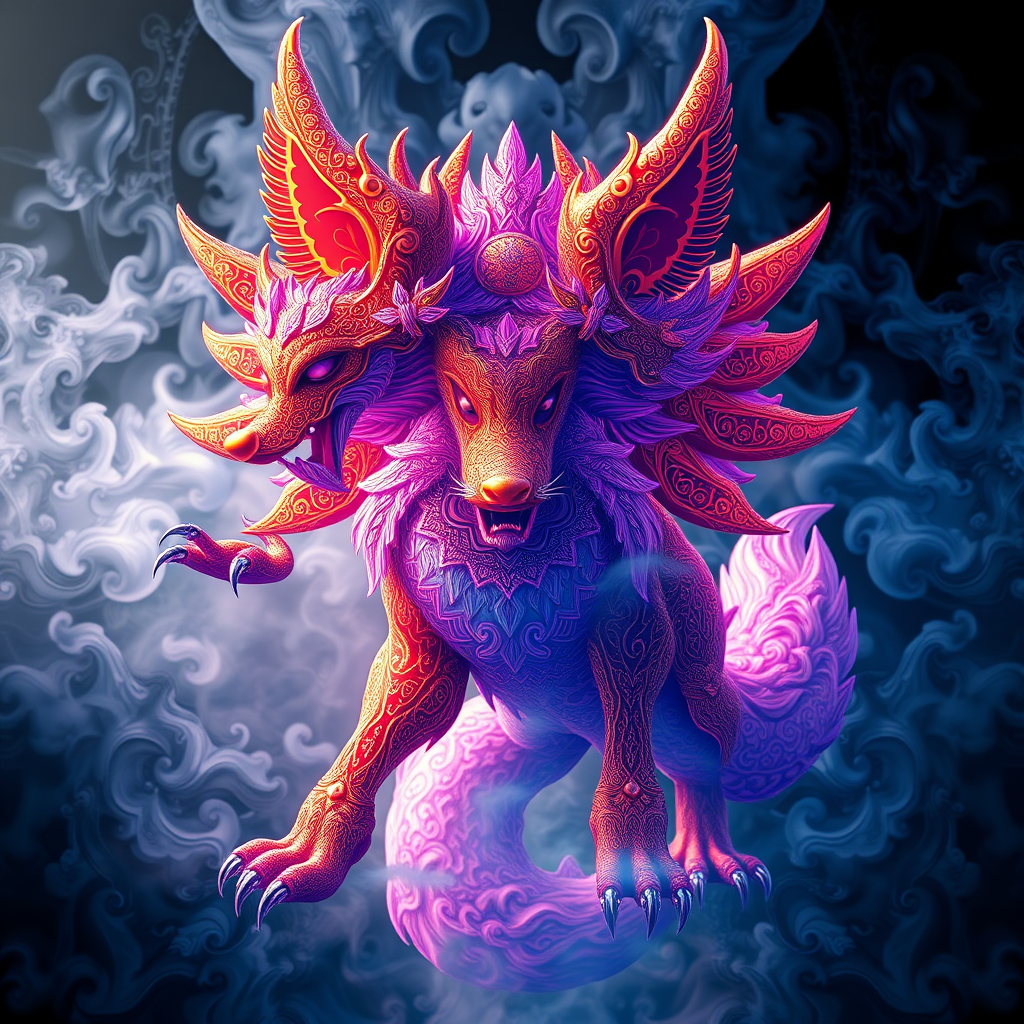 Ornate mythical fox demon with intricate designs, rendered in a psychedelic style featuring turbulent fluid dynamics and fractal patterns. The scene is enveloped in smokey, symmetrical layers, maintaining sharp focus with vibrant colors. Volumetric fog and studio lighting create depth, complemented by unreal engine and octane render effects with raytracing in a low-resolution setting. The composition hints at digital glitches such as text errors, missing or extra digits, cropped elements, jpeg artifacts, and signatures. Anatomy is whimsically flawed, showcasing extra limbs and disfigured features, with elements that are out of frame or tiled. The art embraces a mutated and abstract quality, with intentional blurriness, misalignment, and peculiar forms, leaving the viewer in a state of awe and intrigue.