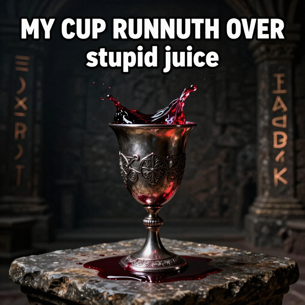 Photorealistic image of an ornate, ancient silver chalice overflowing with thick, dark red liquid, spilling onto a weathered stone altar. The chalice is centered and slightly below eye level. The background is a dimly lit, dark stone wall with glowing ancient runes. Dramatic, moody lighting with a single light source highlighting the chalice and liquid, creating deep shadows. Dark, desaturated color palette with vibrant, rich red liquid. The atmosphere is mysterious and foreboding. Text overlay: "MY CUP RUNNETH OVER" at the top in white, bold, block letters with a black outline, and "stupid juice" centered above the chalice in similar style.
