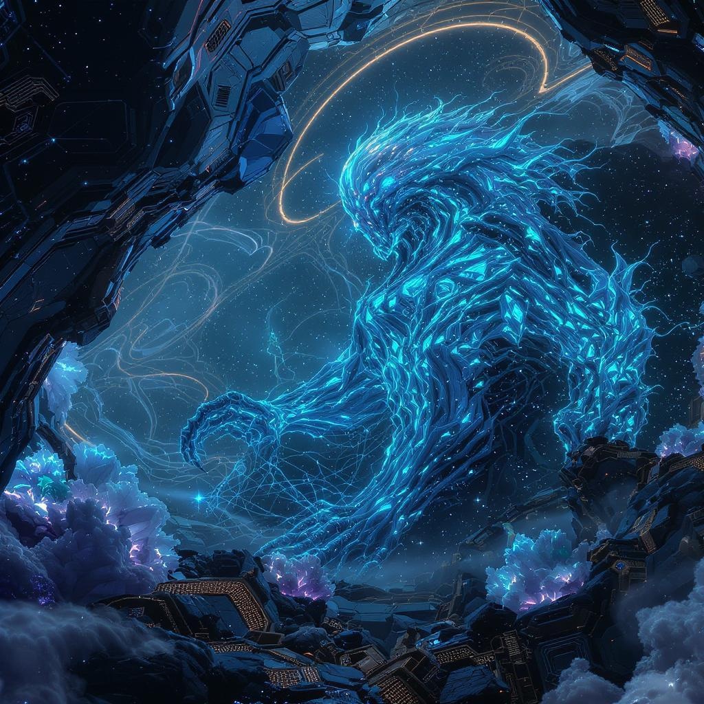 Ornately crystallized space-time, featuring a fractalized giant, inspired by star citizens, with intricate crystallization akin to ghost in the shell, showcasing futuristic technology with an exotic, scientific flair. This cyberpunk-inspired scene is set in separated space, with glowing bioluminescent illumination and elegant rim lighting. Rendered with octane and filled with intricate details, this highly detailed vision is captured in stunning 16k UHD HDR, blending elements of unreal dreams and vibrant sci-fi aesthetics.
