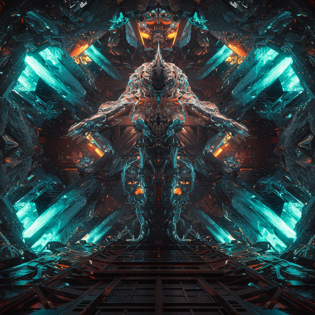 Ornately crystallized space-time, featuring a fractalized giant with elements of star citizen aesthetics, enhanced by futuristic technology and crystallization effects. Inspired by Ghost in the Shell, this scene presents an exotic design with a scientific edge, reminiscent of cyberpunk. The environment is an intriguing separated space, illuminated with bioluminescent glow effects and detailed with rim lighting. Rendered in octane for intricate details, this highly detailed sci-fi vision is captured in 16k UHD HDR, providing a mesmerizing experience. The artistic touch combines elements of FastNegativeV2, UnrealisticDream, and BadDream.