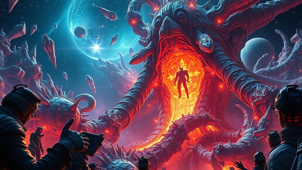 Ornately crystallized space-time with fractalized giants amidst the cosmos, inspired by star citizen and ghost in the shell, featuring futuristic technology and exotic designs. A scientific image with cyberpunk influences showcasing separated space, sci-fi elements, and a captivating glow effect. Bioluminescent illumination mingles with rim lighting, enhanced by octane render techniques. The scene is filled with intricate and highly detailed visuals, presented in stunning 16k UHD HDR, evoking dreamlike and surreal qualities.