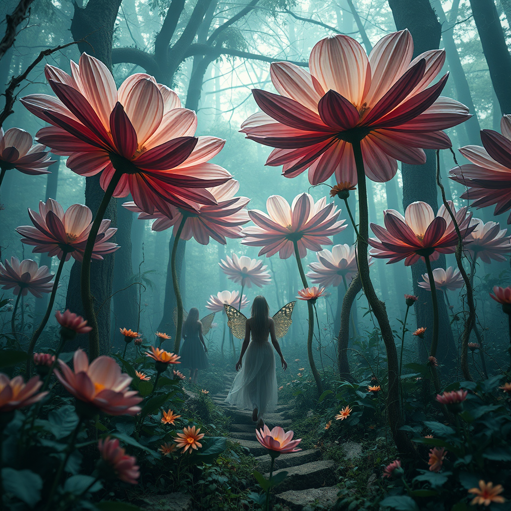 Oscar winning detailed photography, cinematic scene, mystical forest with ethereal elves, surrounded by colossal whimsical flowers, imaginative and surreal, dramatic cinematic shot, concept art, captivatingly fantastical, --ar 14:9 --s 750 --chaos 100