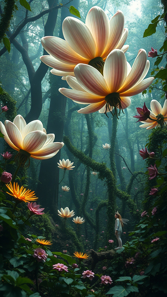 Oscar-winning intricate photography, cinematic scene in a magical forest, featuring mystical elves amidst gigantic fantastical blooms, imaginative, surreal, cinematic capture, conceptual art, lush greenery, vibrant colors, dynamic lighting, whimsical atmosphere, ethereal mood, grand scale, --aspect ratio 14:9 --stylistic 750 --whimsy 100