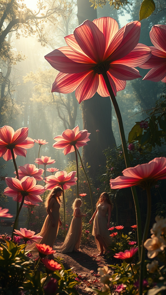 Oscar-worthy detailed photography of a captivating cinematic scene in an enchanted forest, featuring graceful elves mingling among gigantic fantastical flowers, with an artistic and surreal touch, offering an imaginative, high-concept visual feast, capturing the mystery and wonder of this magical realm, ethereal lighting, vivid colors, unexpected elements scattered throughout, evoking a sense of whimsy and astonishment.