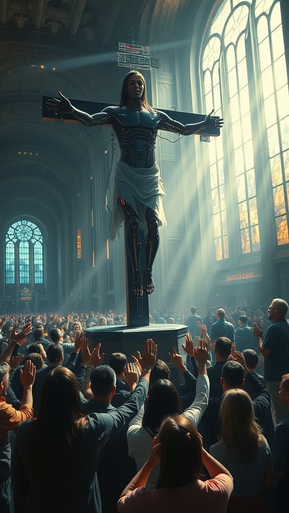Out-of-this-world impressionist oil painting of an awe-inspiring cyber Christ with intricate futuristic cybernetic implants hanging from a techno cross, facing a congregation of exulting believers in worship. The crowd stands in adoration, hands raised, inside a vast futuristic techno cathedral. The mood is futuristic, ceremonial, and grandiose, blending cyberpunk, sci-fi, and neo-futuristic elements. A dark ambience is illuminated by light rays streaming through tall stained glass windows, with volume and dramatic cinematic lighting. The scene is captured in an ultra-wide shot with depth of field, reminiscent of Claude Monet's impressionist style. This evocative representation portrays technology as the new faith of humanity, with people praying at the altar of technology to a techno Christ. The painting eschews elements like wings, mockups, or poor anatomical depictions, emphasizing clarity and high-quality composition.