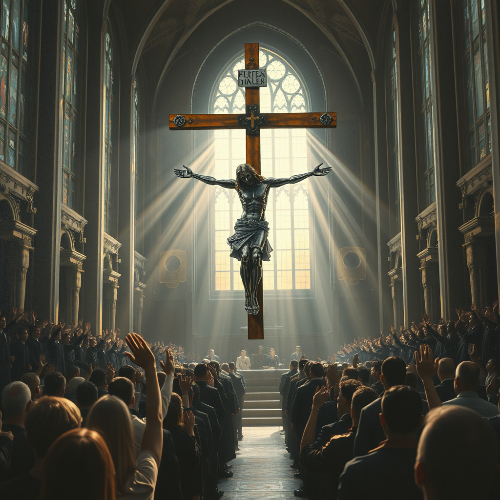 Out-of-this-world impressionist oil painting of an awe-inspiring cyber Christ suspended from a techno cross. The Jesus figure is adorned with intricate futuristic cybernetic implants, confronting a congregation of exultant believers who worship with upraised hands. The crowd stands in adoration within a vast, futuristic techno cathedral. The atmosphere is grand and ceremonial, exploring themes of cyberpunk, sci-fi, and neo-futurism. The dark ambience is punctuated by light rays streaming through tall stained glass windows, creating volume and dramatic cinematic lighting. Capturing an ultra-wide shot with depth of field, this impressionist style oil on canvas draws inspiration from Claude Monet, visually representing technology as the new faith of humanity, with people venerating at the altar of technology before a techno Christ.