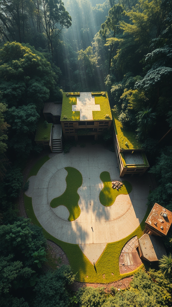 Overhead view of an expansive brutalist concrete skatepark carved into the dense heart of the Amazon jungle, surrounded by remnants of abandoned, moss-covered buildings, evoking a profound sense of solitude and seclusion. Captured through the lens of a vintage Leica camera, the scene is bathed in gentle, diffused sunlight that filters through the thick canopy, lending an ethereal quality to the stark, geometric structures. The juxtaposition of raw concrete against the vibrant chaos of nature creates a striking contrast, highlighting the eerie beauty of urban decay immersed in untamed wilderness.