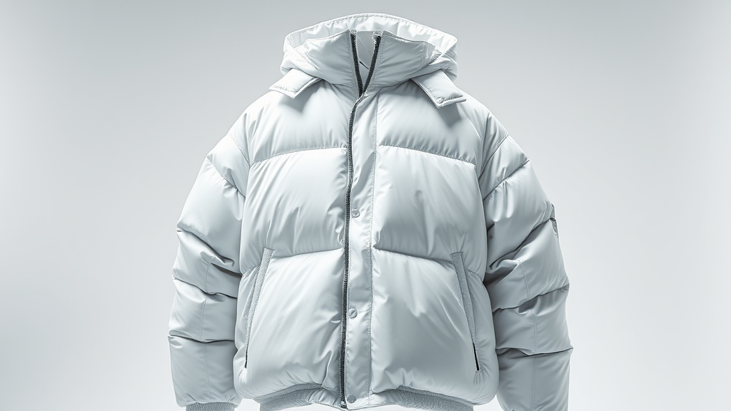 Oversized puffer jacket drawing inspiration from Off-White, surrounded by crisp white lighting in a studio setting, captured in ultra high definition 8k. Photographed with octane rendering for an insanely detailed and professional finish, with meticulous color grading. The image highlights fine details, creating a striking visual in a vertical 9:16 aspect ratio.