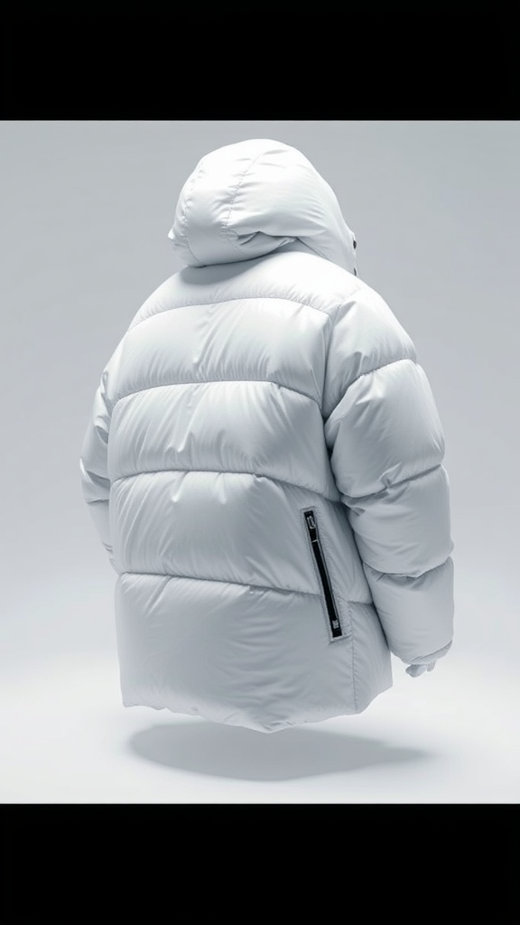 Oversized puffer jacket inspired by Off-White, sleek white lighting, high-end studio setup, ultra HD, octane rendering, extraordinarily detailed textures, intricate stitching, expert color grading, high resolution, --version 4 --aspect ratio 9:16.