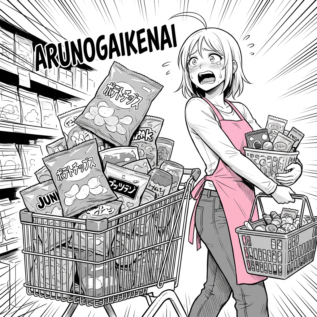 A wide-eyed woman in a pink apron looks distressed as she pushes a shopping cart overflowing with potato chips and snacks. The monochrome manga-style illustration captures a moment of comedic panic in a supermarket aisle.