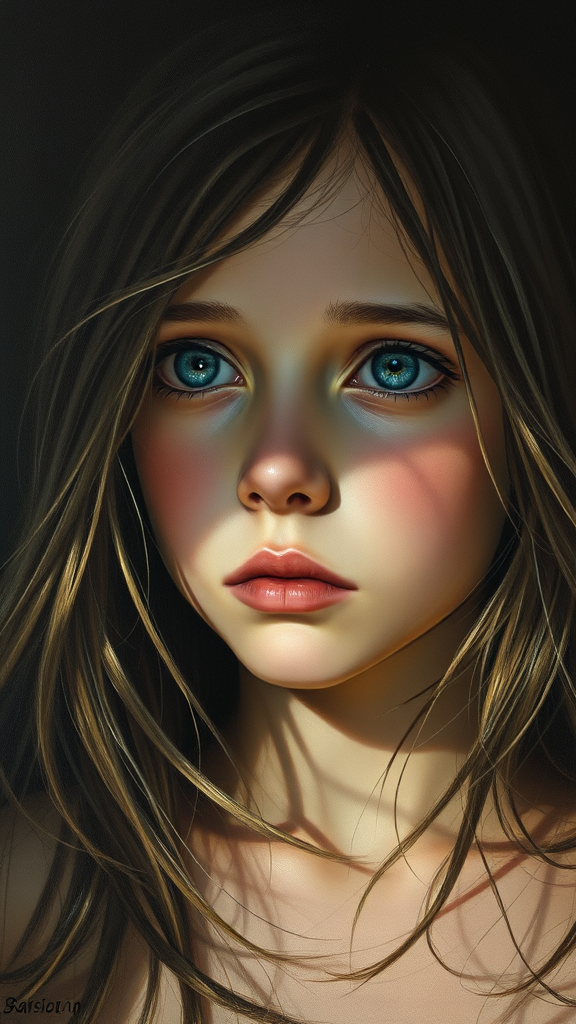 Paint a portrait of a girl with empty, hollow eyes, gazing sunkenly into the distance, surrounded by intricately woven shadows that evoke a sense of unease. Incorporate a Durerian level of realism with measured, chunky brushstrokes that imbue the painting with a tactile, grainy texture, reminiscent of muted earth tones.