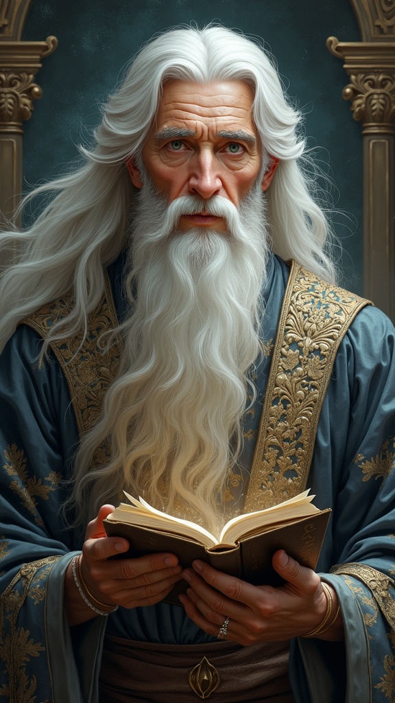 View this AI-generated image featuring painted portrait of an enigmatic magic man with flowing silver white hair possessing a look of wisdom and calm his face reflects maturity and kindness with eyes that tell a thousand stories clad in a traditional ornate costume he holds an ancient tome suggestin