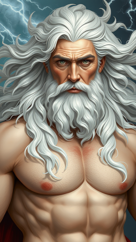 Painted portrait of a majestic Zeus, the god of thunder, embodying the essence of Greek mythology, with flowing white hair, a strong and mature demeanor, exuding handsome features. His upper body reveals a powerful, muscular build with a subtly hairy torso. This fantasy depiction is intricate and elegant, showcasing highly detailed digital artwork reminiscent of Art Nouveau influences, blending the styles of Gaston Bussiere and Alphonse Mucha. The composition has a smooth, sharp focus, capturing the divine aura, and serves as a concept art piece with an artistic flair.
