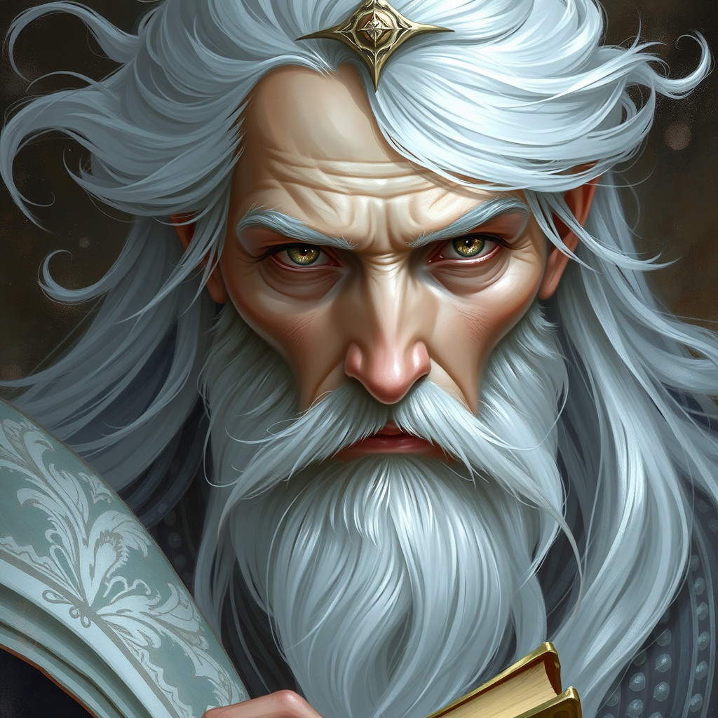 Painted portrait of an enigmatic wizard, flowing white hair, shimmering silver tones, wise and serene demeanor, captivating and intricate eyes, gentle and mystical aura, adorned in traditional ornate robes, ancient tome in hand, mythical essence, refined and detailed craftsmanship, richly textured and elegant, highly intricate and multi-layered, ethereal presence. Digital painting, concept art, smooth transitions, sharp details, illustrative style.