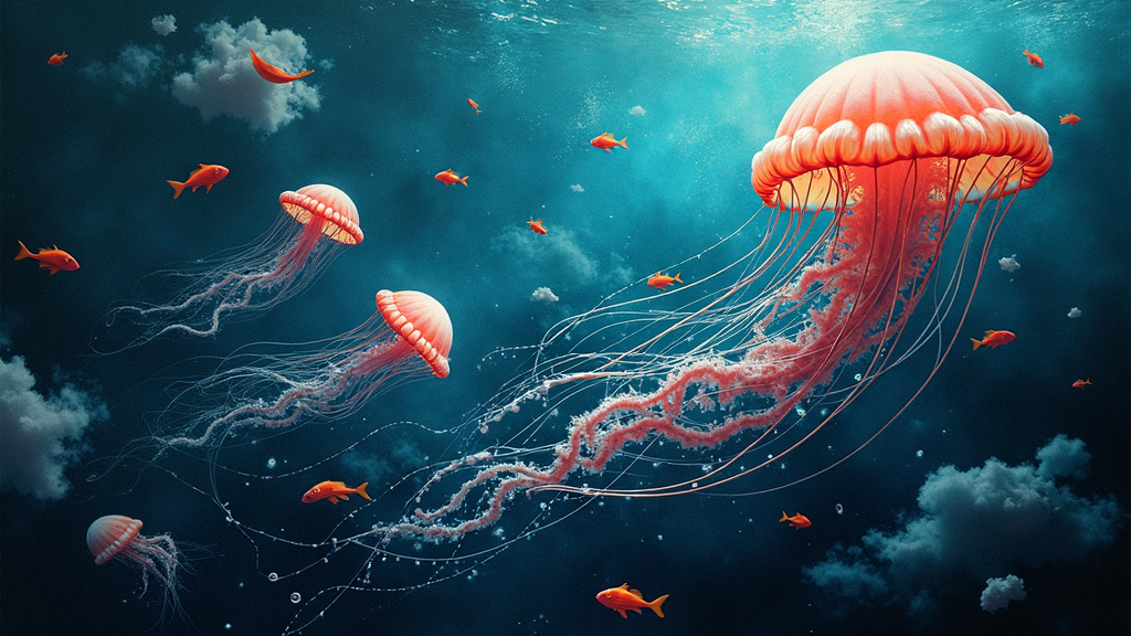 View this AI-generated image featuring a surreal 3d painting depicting ethereal jellyfish gracefully entwined with vibrant swirling schools of colorful fish and wispy clouds rendered in a dark and chaotic aesthetic the palette features light black and shimmering aquamarine tones with an animated gif