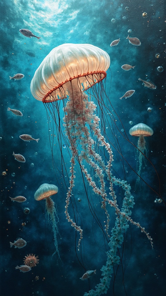View this AI-generated image featuring a surreal 3d painting depicting ethereal jellyfish gliding gracefully amidst vibrant swirling schools of fish and wispy drifting clouds the composition is infused with a dark chaotic energy featuring a palette of light black and shimmering aquamarine animated e