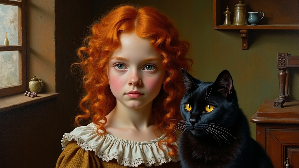 A vibrant painting depicts a redheaded girl with striking curls, accompanied by her sleek black cat, set against the backdrop of a quaint 17th-century interior. The scene is brought to life with bold, swirling brushstrokes and powerful, rich colors that reflect the girl's spirited personality. Her dress, reminiscent of early 1600s fashion, features intricate detailing and deep hues that contrast beautifully with the warm, dimly lit room. The composition is reminiscent of Vermeer’s style, capturing the essence of the location through an interplay of shadow and light that highlights the texture and atmosphere, instilling the painting with depth and emotion.