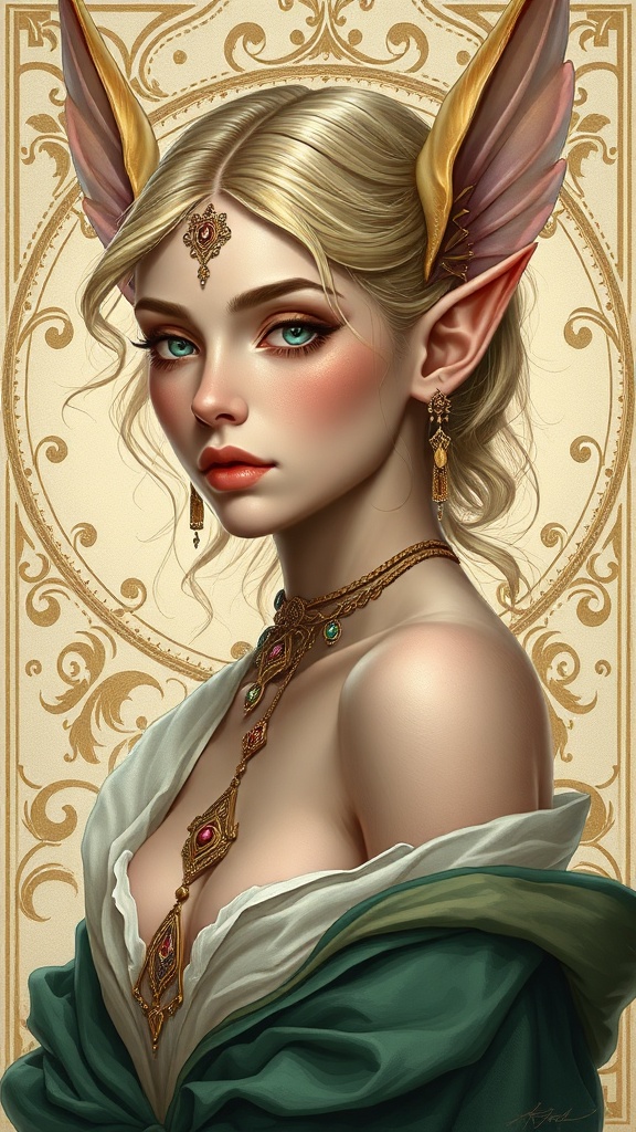 A digital painting of a female elf, characterized by intricate and elegant features, showcasing a highly detailed and smooth illustration. The art captures the essence of concept art found on ArtStation, with a style inspired by Artgerm, Greg Rutkowski, and Alphonse Mucha. The composition maintains sharp focus and is designed in 8k resolution, with creative elements enhancing her ethereal appearance. Her elongated ears and graceful demeanor are depicted with flowing garments and delicate jewelry, blending fantasy with art nouveau influences. The background features subtle, ornate patterns that complement her presence, enhancing the overall aesthetic without overshadowing her central elegance.