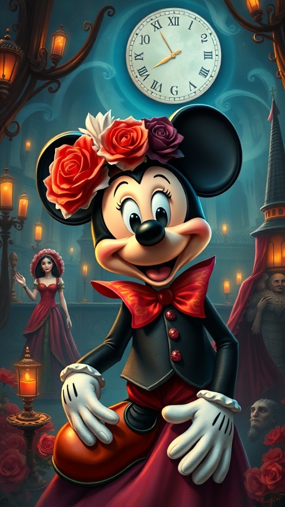 A vibrant painting featuring Mickey Mouse adorned in elegant Catrina makeup, capturing the charm of Disney animation. The scene is rendered in stunning 32k UHD, showcasing lively character caricatures set against a mysterious, enchanting backdrop. The composition is enriched with intricate details and lively tableaus, reflecting a captivating blend of cultural and artistic elements in an --ar 4:5 aspect ratio.