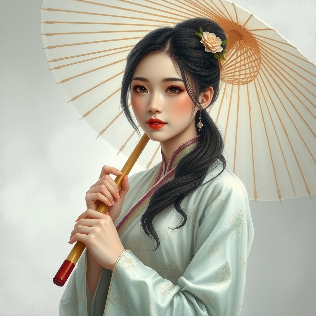Painting of a woman in traditional Chinese attire holding a delicate bamboo umbrella, styled like an enchanting romantic manga, exuding an ethereal translucence with a palette of misty whites and gentle grays, breathtakingly beautiful, reminiscent of romantic illustrations, infused with shades of soft white and tender green, capturing graceful femininity, atmospheric and dreamy.