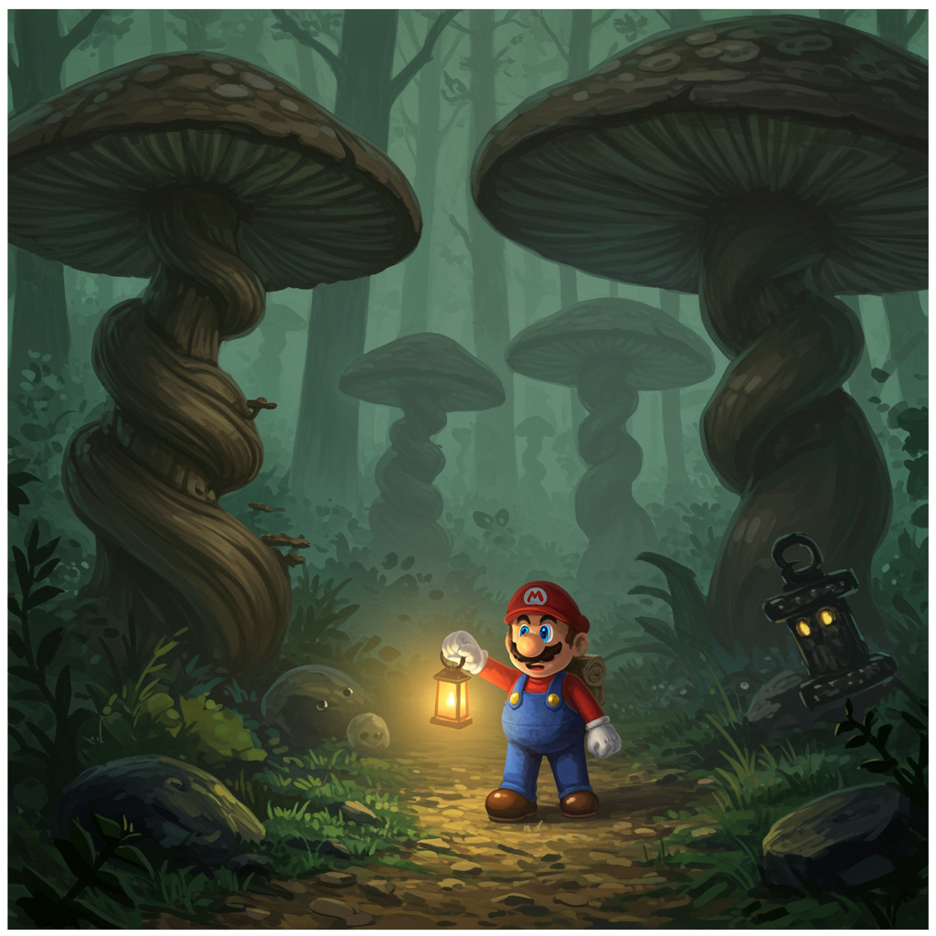 In a captivating painting of oil on canvas, the iconic Super Mario sets off on an intrepid quest deep within an enigmatic forest, shrouded in a mystical fog that adds an aura of secrecy and anticipation. Towering, ancient mushrooms with intricate, twisted forms dot the landscape, whispering of the forest's concealed marvels. Holding a lantern that bathes the surrounding path in a gentle, warm light, Mario's journey is pervaded by an air of suspense and curiosity, as if each turn could unveil a magical wonder. The forest pulses with hidden life, the subtle murmurings of unseen creatures in the undergrowth enhancing the enchanting ambiance. The artwork emphasizes chiaroscuro, highlighting the play of light and shadow, drawing viewers into the depths of this mysterious and wondrous adventure, where the familiar world of Mario meets the allure of the unknown.