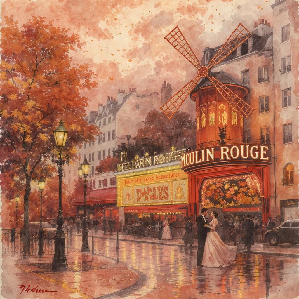 Paintings of Paris, blush champagne, reminiscent of Mark League's style, a watercolorist mastery, intricate composition, textured surface, autumn ambiance, early evening glow, set in 1950, romantic couple, iconic Moulin Rouge backdrop.