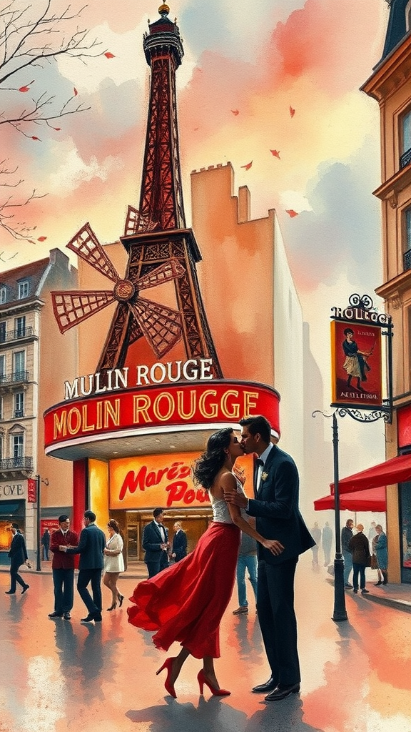 Paintings of Paris, rose-tinted bubbly, style akin to Mark League, masterful watercolor composition, textured with a rugged charm, Autumn twilight, year 1950, couples in love, dancing lights of Moulin Rouge.