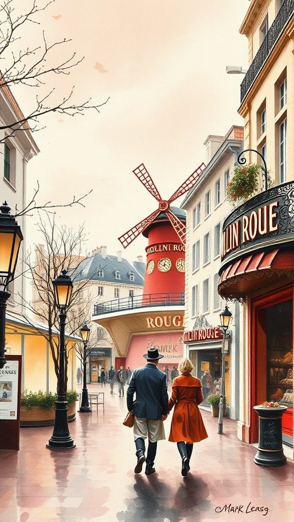 Paintings of Paris, rose-tinted champagne hues, crafted in the style of renowned watercolorist Mark League, featuring skillful compositions with a rough texture; set in the autumn season during the early evening of 1950, capturing the essence of romance with lovers strolling near the iconic Moulin Rouge.