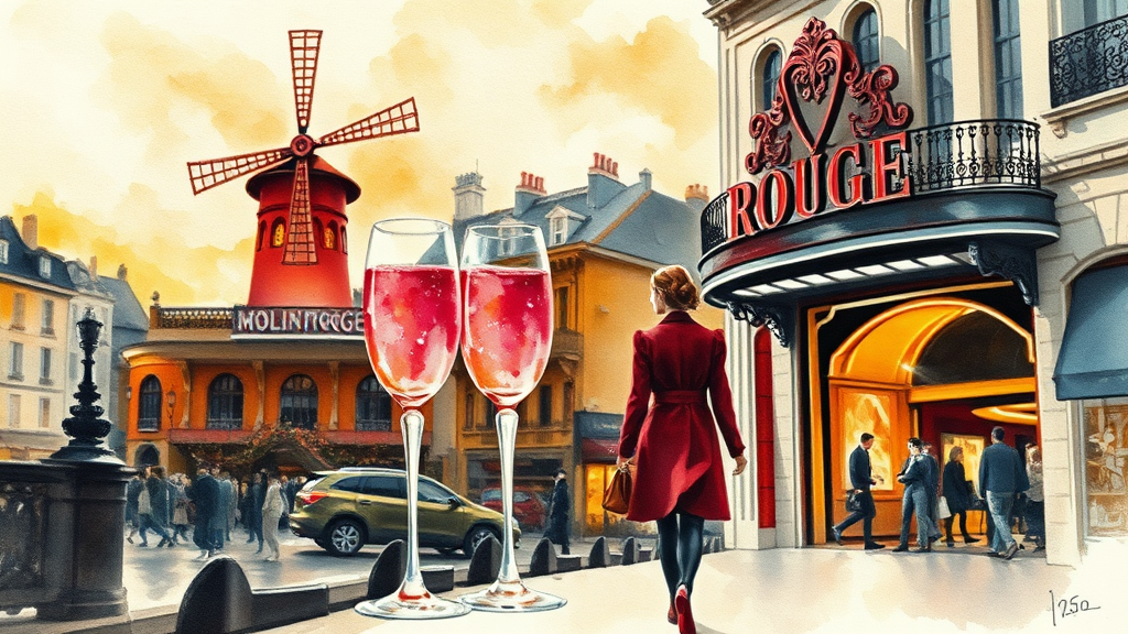 Paintings of romantic Parisian scenes, effervescent pink champagne flutes, rendered in the distinctive style of a master watercolorist. Skillful composition captures the essence of a vibrant city bathed in the warm hues of autumn, with textures both rough and refined. As twilight descends on the year 1950, lovers stroll arm in arm, bathed in the soft glow of early evening light, their silhouettes outlined against the iconic backdrop of the Moulin Rouge.