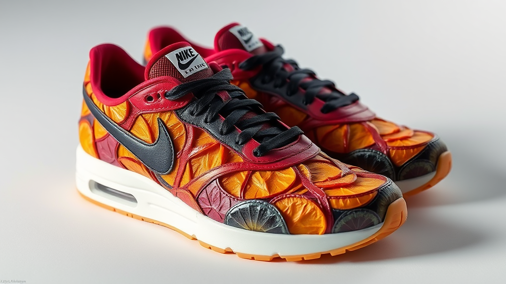 Pair of vibrant shoes crafted from dried fruit peels, detailed 3D render showcasing vivid colors, sleek design, artistic composition, adorned with Nike emblem.
