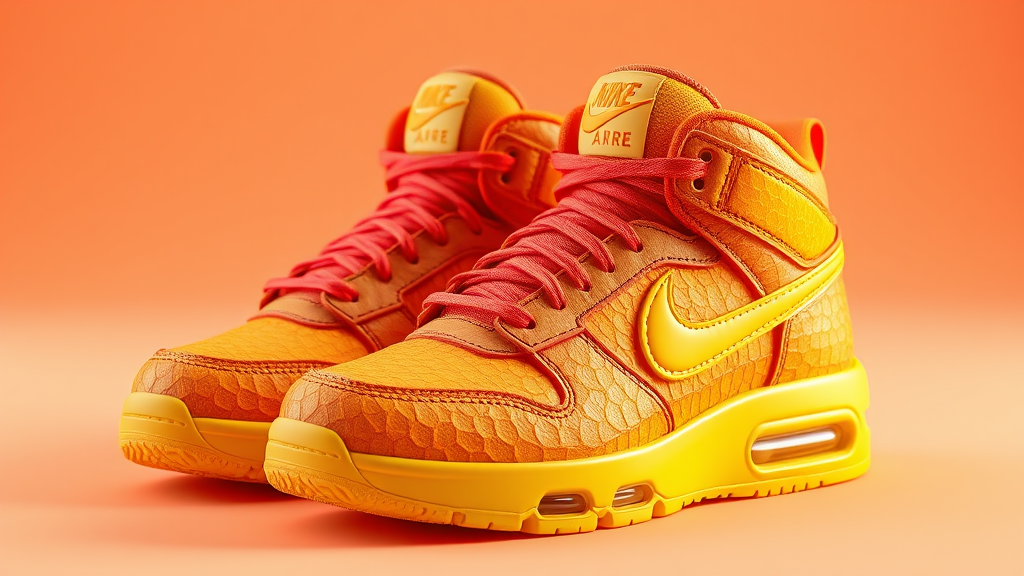 Pair of vibrant sneakers crafted from sun-dried fruit peels, featuring a stunning 3D render with an eye-catching mix of bright and bold colors, maintaining a sleek composition and visually appealing design, adorned with an iconic Nike emblem.