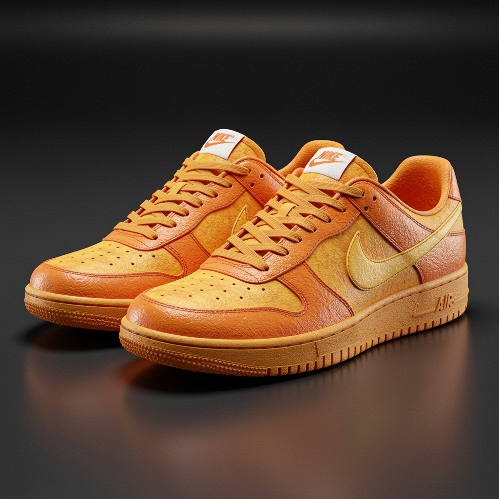 Pair of vibrant, uniquely designed shoes crafted from sun-dried fruit peels, featuring a sleek 3D render with a focus on vivid colors and a pristine composition, complemented by an artful Nike emblem.