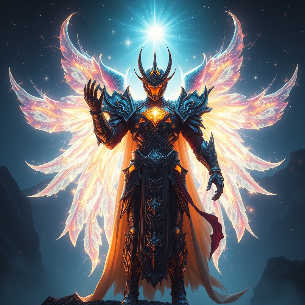View this AI-generated image featuring paladin clad in luminous celestial armor infused with intricate fantasy elements surrounded by a stunning supernova like aura enveloped in ethereal volumetric lighting standing tall against a majestic 2 3 aspect ratio twilight backdrop. Created using advanced A