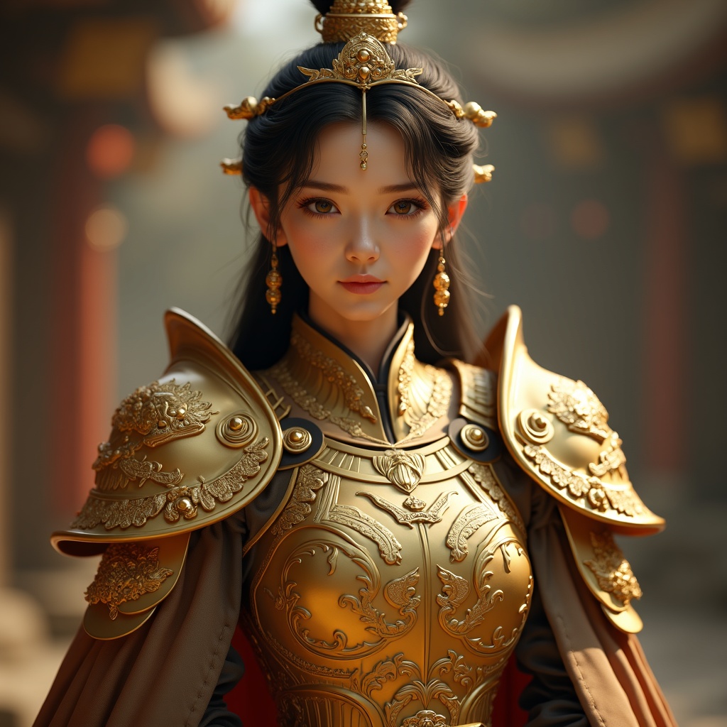 A stunning paladin girl with a perfect face stands regally, her full body enveloped in exquisitely detailed gold armor showcasing motifs of lions. The intricate embellishments shimmer with authenticity, capturing the essence of photorealism in a cinematic 8k render. Her expression carries a blend of strength and grace, with hints of cartoon and anime influence in her features, reflecting her Asian heritage. The scene possesses a subtle cinematic blur, adding depth and allure to the 3D rendered imagery, while the armor's artistry provides a striking contrast to the lifelike textures of her surroundings.