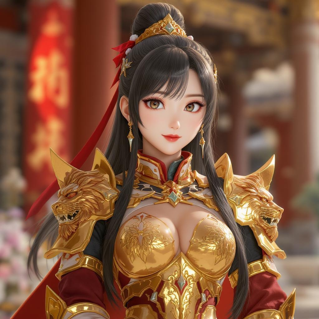 Paladin girl, full body shot, flawless features, radiant gold armor, embellished with lion motifs, exquisite details, high-definition quality, photorealistic finish, cinematic focus 8k, soft blurred background, vibrant cartoon-anime style, Asian descent, expertly crafted 3D render.