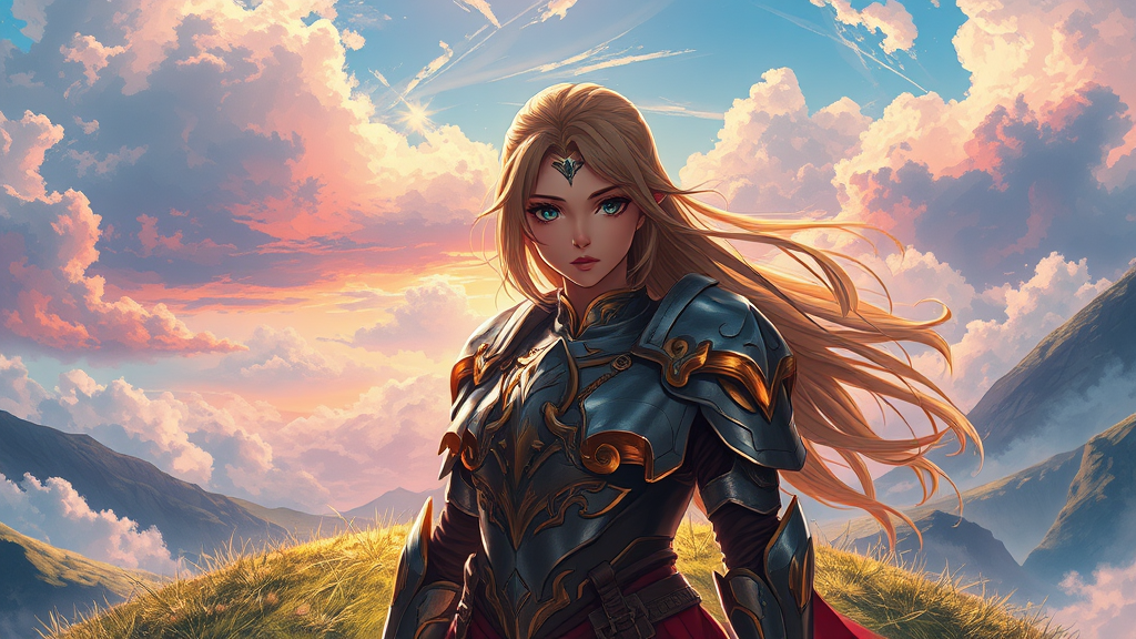 Paladin girl standing majestically atop a gentle hill, framed perfectly in the center of a panoramic scene; her face exudes an ethereal beauty, depicted with intricate detail in an anime style. This breathtaking key visual captures the essence of Carne Griffiths and Conrad Roset’s artistic influence, combined with the vibrant imagination of gibbli 8k. Her armor gleams with stunning intricacy, reflecting the cinematic atmosphere around her, against a backdrop of swirling colors and expansive skies.