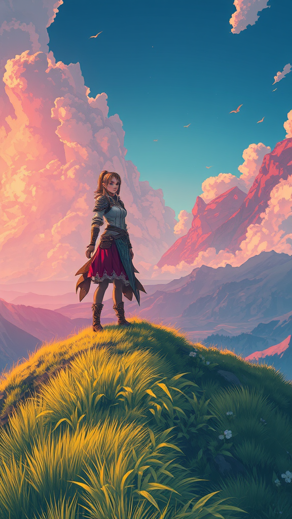 Paladin heroine poised on a solitary hilltop, her presence centered with a meticulously crafted and stunning face, portrayed in a vivid anime style. The scene serves as a key visual, rich with intricate and breathtaking details, exuding vibrancy in a panoramic, cinematic vista. Inspired by the artistic styles of Carne Griffiths and Conrad Roset, ghibli-esque in an ultra-high-definition 8k resolution.