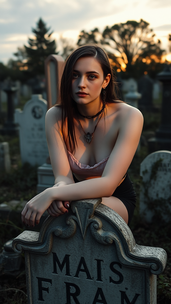 Pale pink pastel goth with black metal influence sitting on a weathered tombstone, intense side sunlight casting dramatic shadows on her face, her skin appears porcelain-like under the stark light, subtle glints of metal from her accessories catching the sun, devoid of eyebrows, surrounded by an overgrown cemetery, sky awash with muted hues of dawn, kodak portra 800 film style, eerie elegance in a 9:16 aspect ratio.