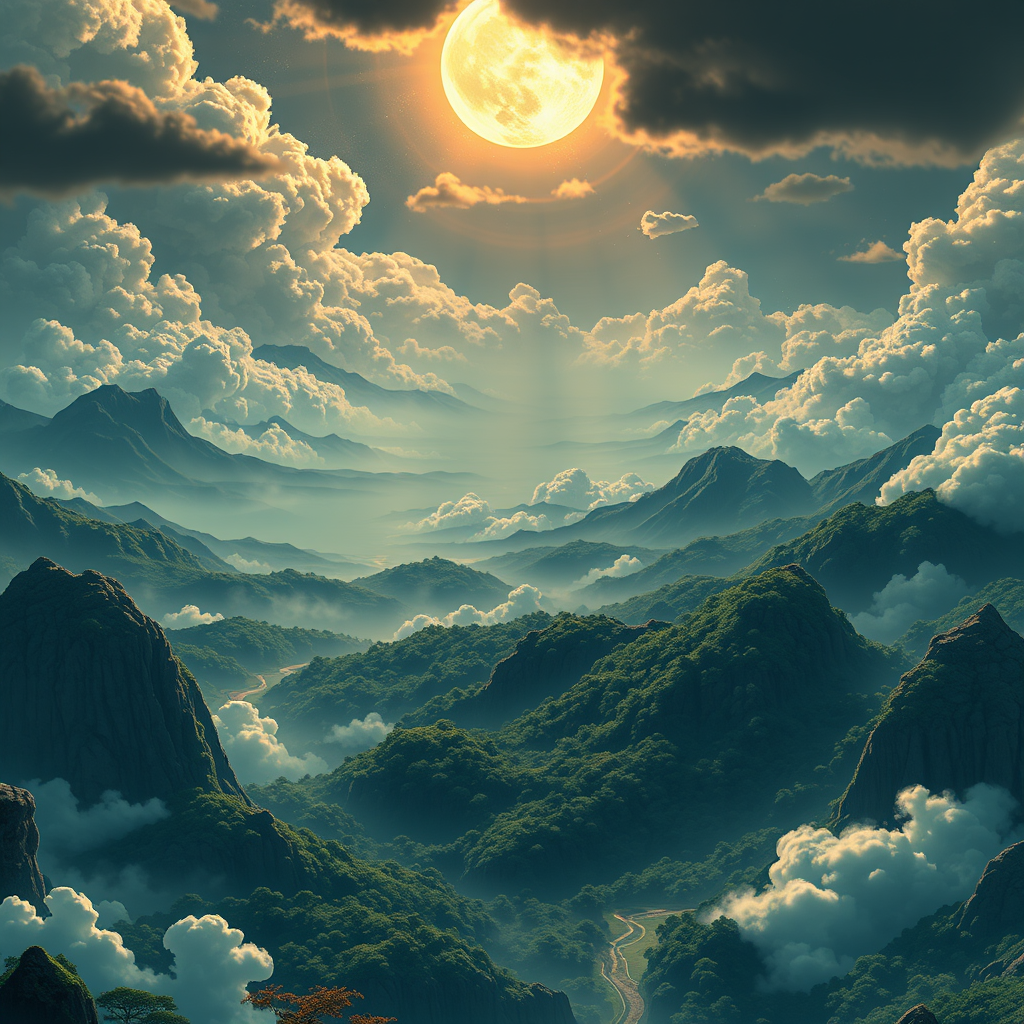 Panoramic view of a majestic Japanese landscape, reminiscent of a Kingdom Hearts aesthetic, with flowing ink-style brush strokes and intense, dramatic lighting; captured in stunning 8k detail, showcasing a harmonious blend of nature and fantasy.