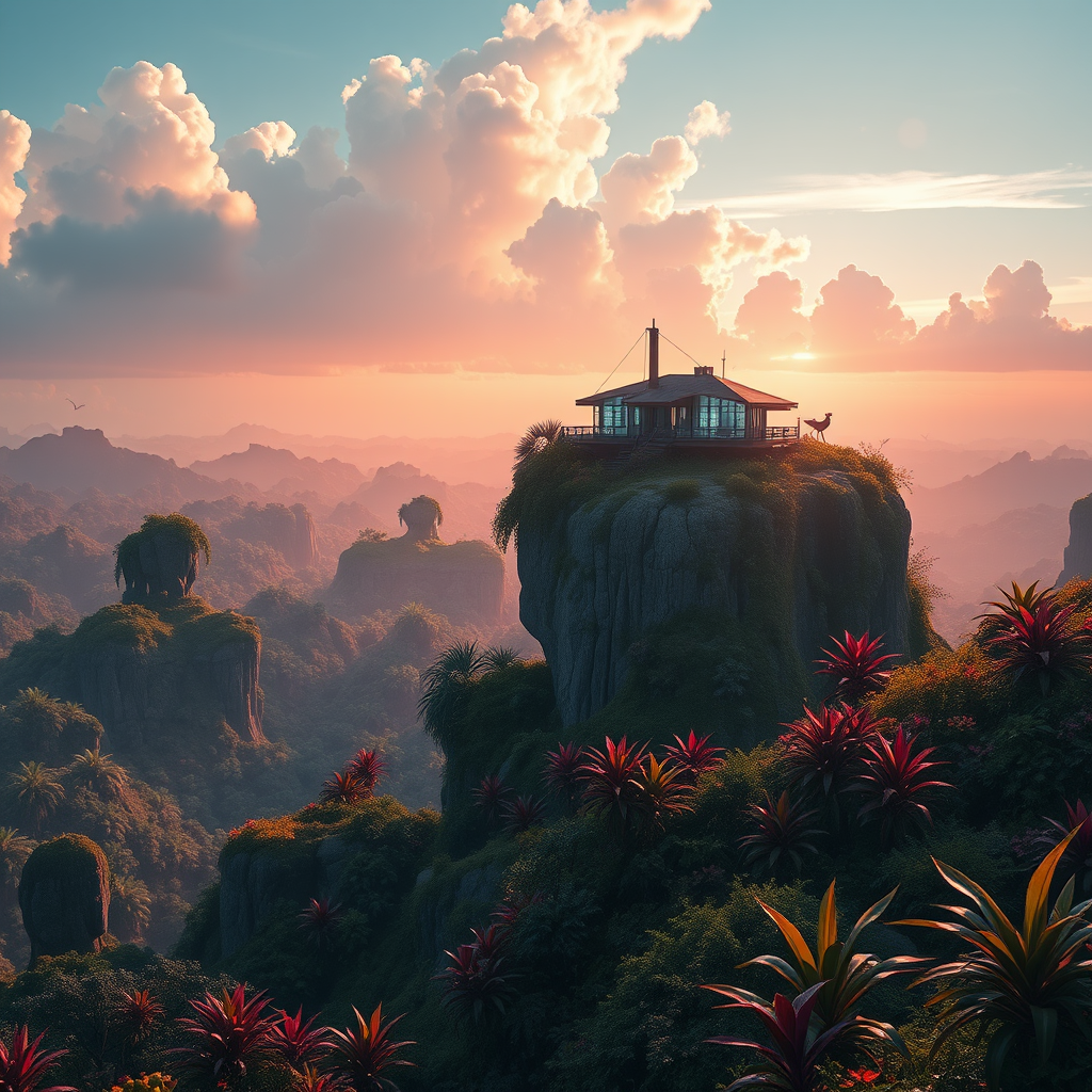 Panoramic view of an exotic extraterrestrial jungle landscape, vibrant alien flora stretching towards the sky, a futuristic house perched on the edge of a craggy cliff, reminiscent of Horizon Zero Dawn’s ethereal style, illuminated by streams of volumetric lighting filtering through dense, colorful foliage, capturing the scene in breathtaking 8k resolution, atmospheric clouds touching a distant, surreal horizon under a vast otherworldly sky, wildlife subtly seen within the depth of the forest.